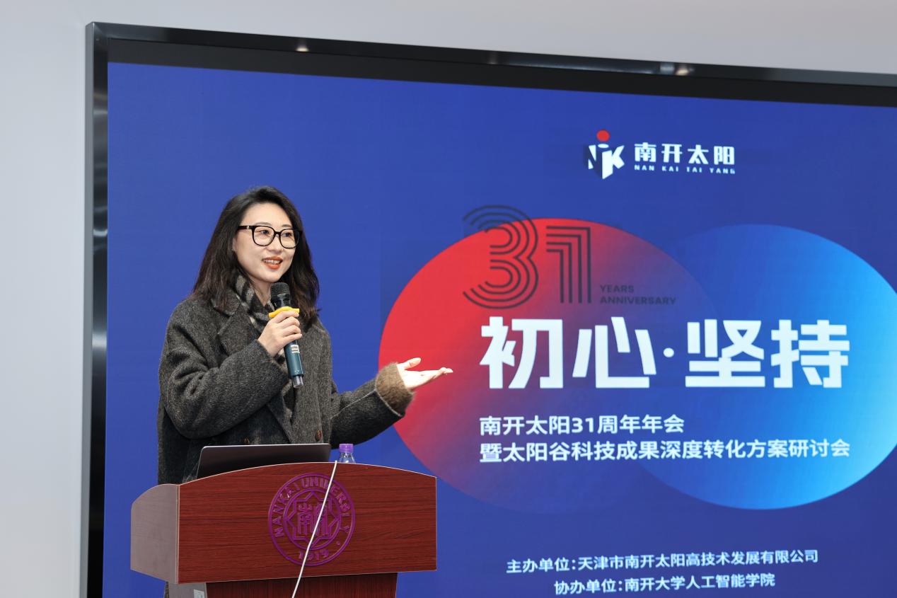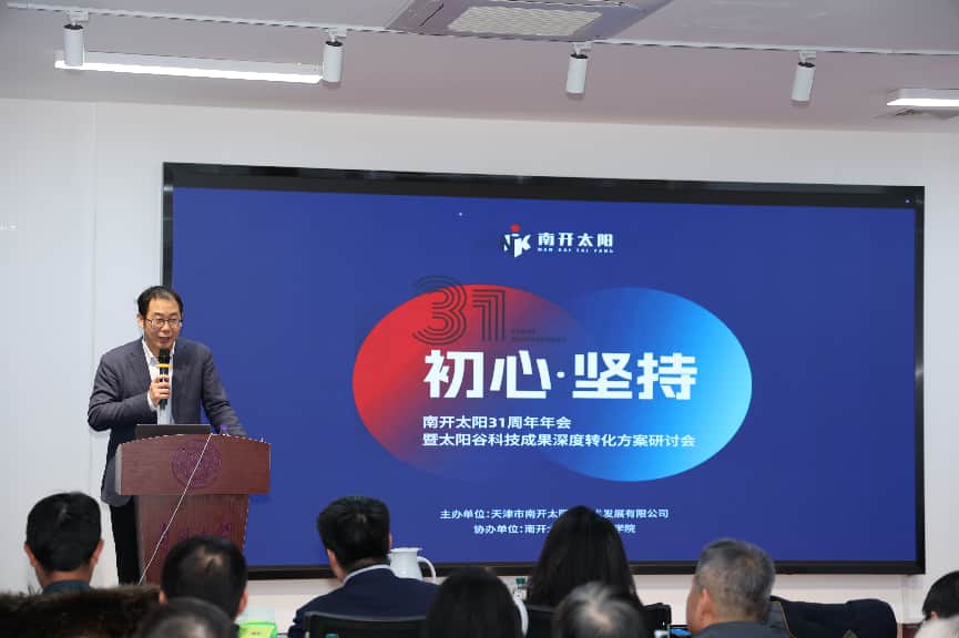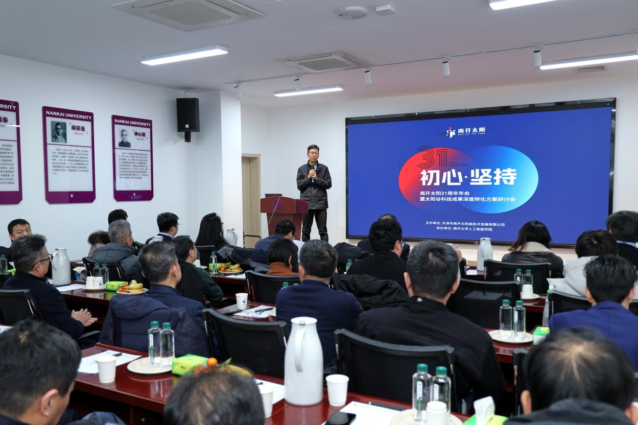 2025年12月20日,由天津市南开太阳高技术发展有限公司主办、南开大学人工智能学院协办,以“初心、坚持”为主题的南开太阳31周年年会暨太阳谷科技成果深度转化方案研讨会在南开大学科技园路演厅隆重举办。南开大学党委副书记牛文利,南开大学人工智能学院党委书记仇林出席会议并分别致辞。南开太阳全体员工、太阳谷项目发起人、南开大学人工智能学院相关人员、关心和支持企业、学院发展的各界人士,近百人齐聚一堂,就企业发展、高校科技成果转化、人才储备等议题展开研讨。本次会议由天津市南开太阳高技术发展有限公司董事长、南开大学1995级会计系校友苑晓宇主持。